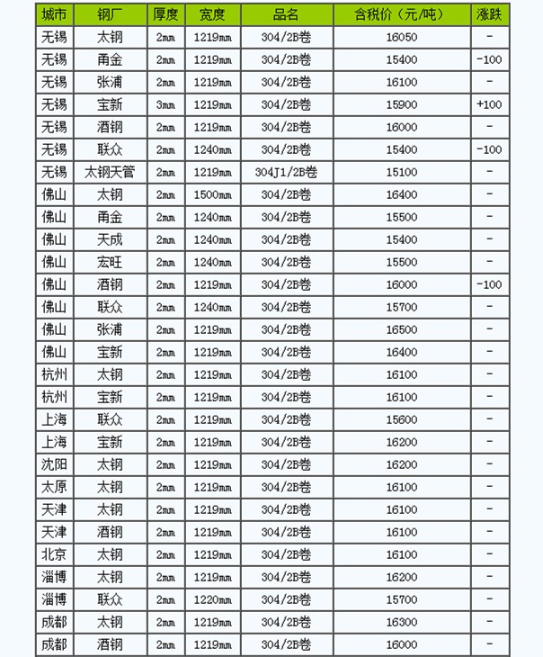 11月7日全國(guó)城市304/2B冷軋卷的價(jià)格基本平穩(wěn),主流報(bào)價(jià)在15100-16400元/噸。